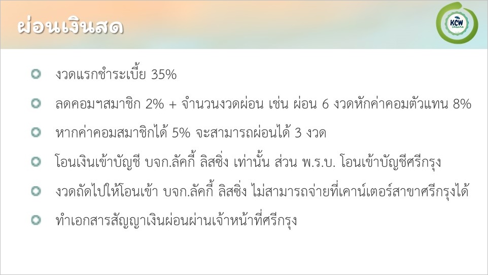 2. ได้รับผลตอบแทนเมื่อลูกค้าผ่อนเบี้ยครบ โดยจะลดผลตอบแทน 1% ต่องวดของการผ่อนเช่น ผ่อน 3 งวดจะลดผลตอบแทนลง 3%